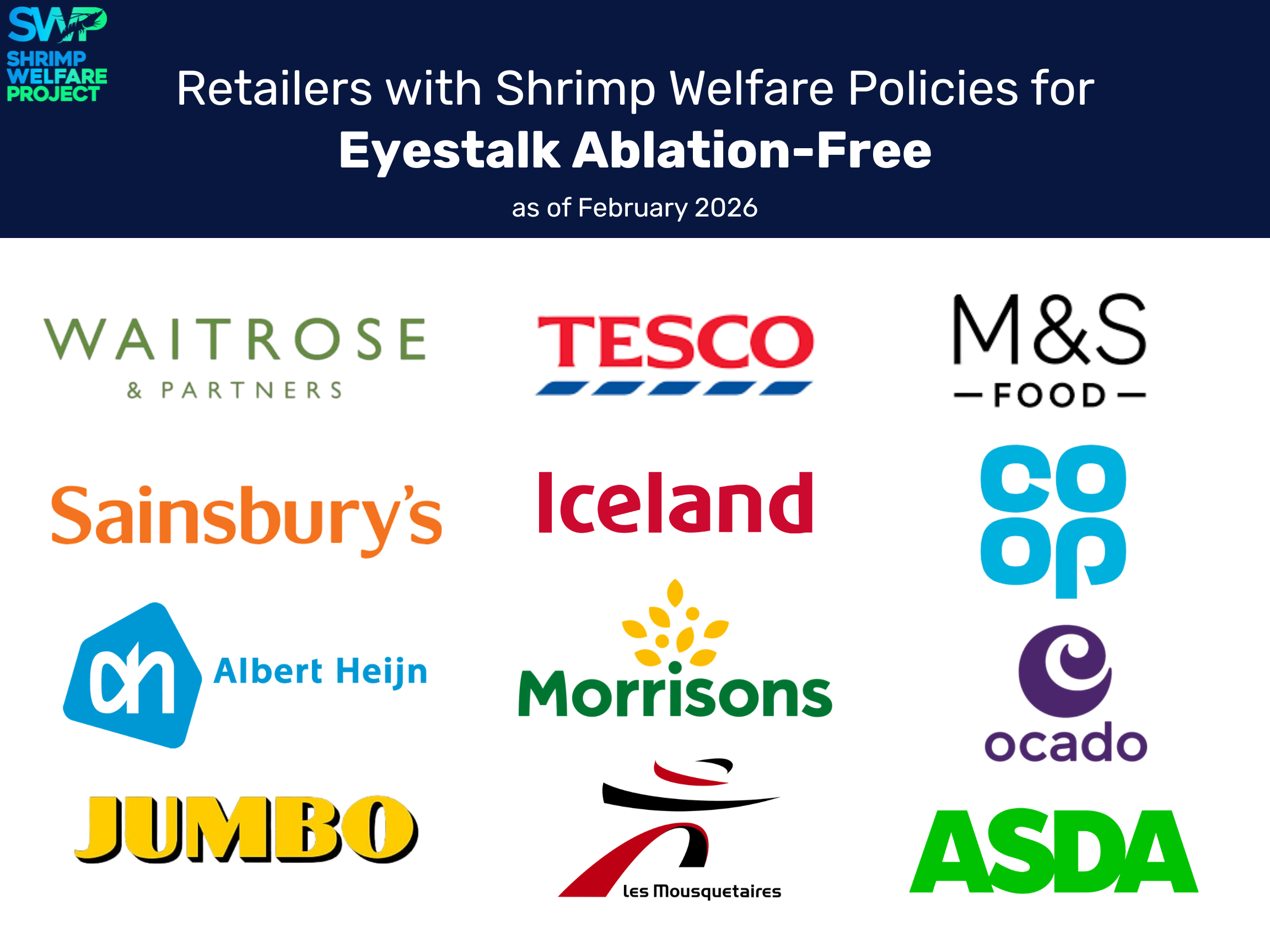 Shrimp Welfare Project celebrates producers, suppliers, and retailers who have committed to using non-ablated broodstock in their supply chains. We raise awareness and promote more humane practices in the shrimp industry, shining a spotlight on companies who are leading the way in responsible and ethical aquaculture. Learn more about our Eyestalk Ablation-Free programme.
